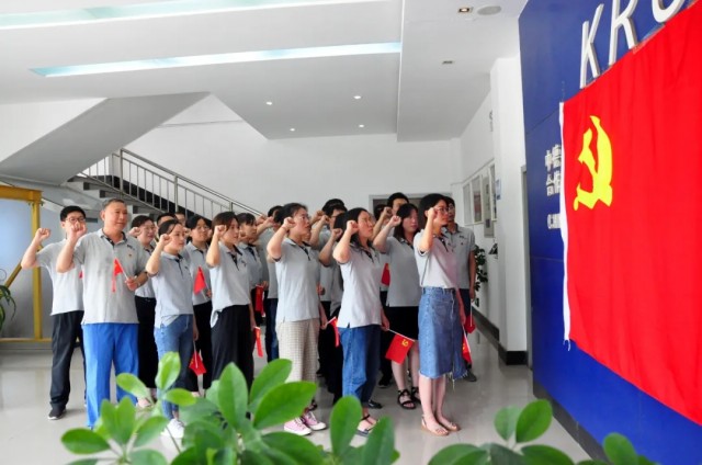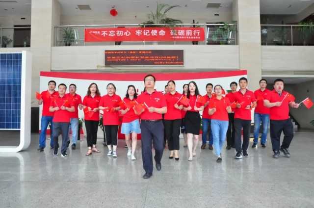 聽到熟悉的樂曲響起,阿特斯光伏電力(洛陽)有限公司的黨員們從各個辦公室走出,隨著節(jié)拍舞動手中的小國旗,帶著滿腔的熱忱、昂揚的斗志,高聲唱起“他指給了人民解放的道路,他引導中國走向光明......”