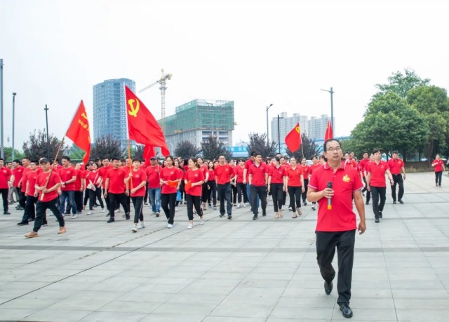 蔚藍的天空下,闊大的中心湖平臺上,一面鮮艷的黨旗高高聳立。兩名旗手高舉黨旗和國旗,沿著炎黃科技園黨建長廊向平臺飛奔而來。
